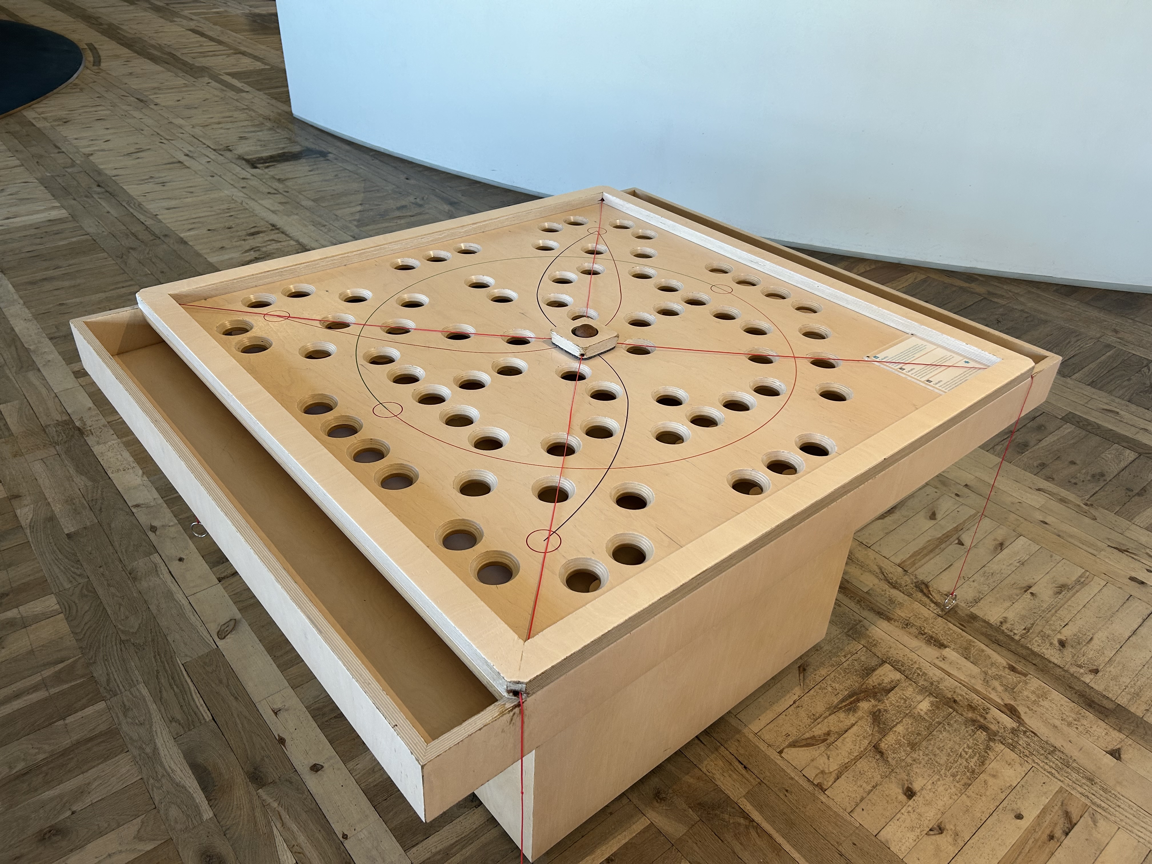 Genau diese Erfahrung greift das Exponat „Calcetto“ auf. Auch hier steuerst du nicht allein, sondern gemeinsam mit einem Partner eine Kugel über ein Brett. An den Rändern kannst du über Schnüre die Spielfläche kippen und so die Richtung der Kugel bestimmen. Das Ziel ist klar: Die Kugel soll einer vorgegebenen Bahn folgen. Doch der Weg dorthin ist knifflig. Überall lauern Löcher, die die Kugel verschlucken. Nur wenn ihr miteinander kommuniziert und die Bewegungen abstimmt, gelingt es euch, die Bahn präzise nachzufahren.
