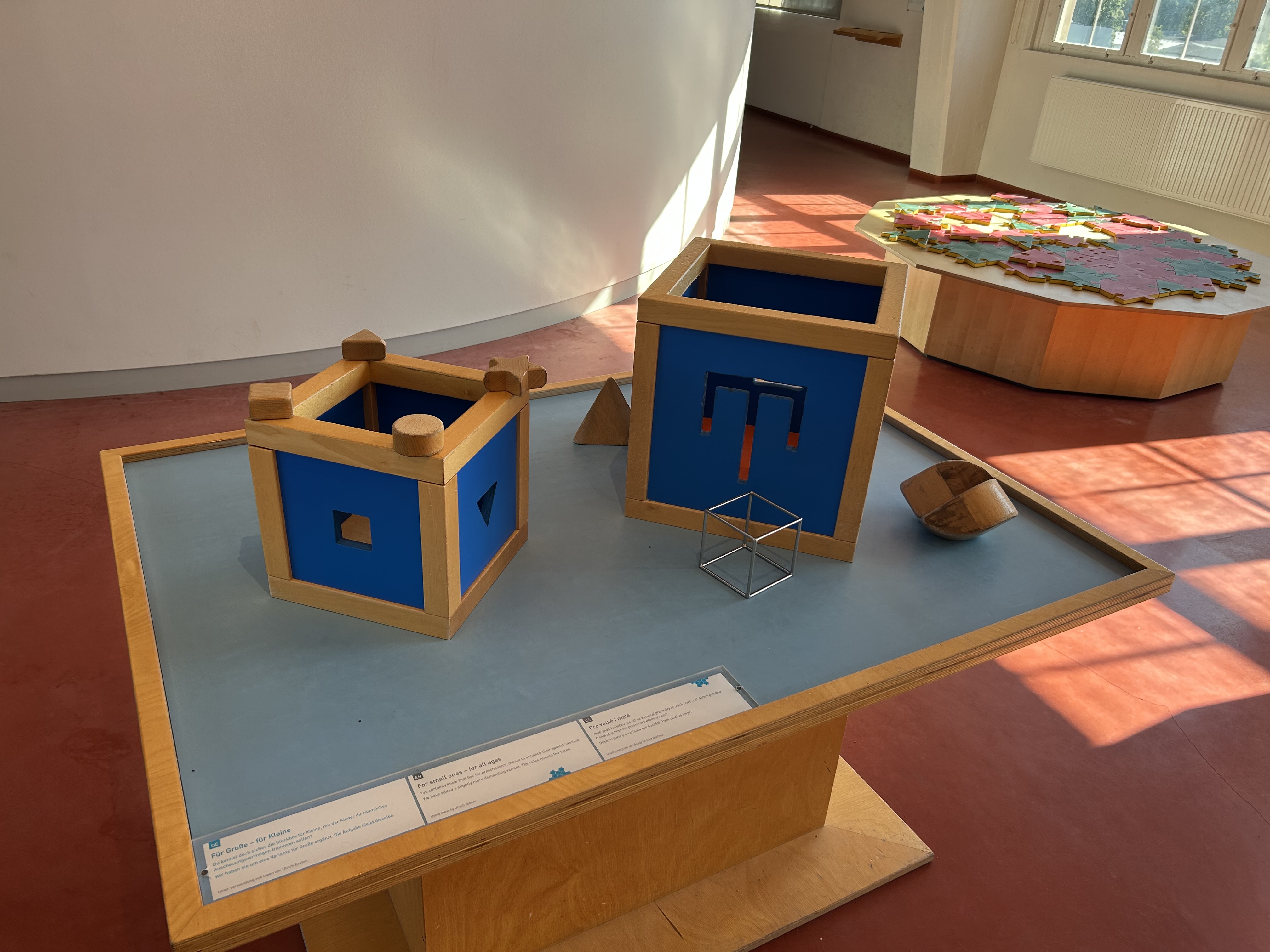 Das Exponat „Für Große, für Kleine“ knüpft genau an diese Erfahrung an – nur eine Nummer anspruchsvoller. Statt einfacher Klötze und klar erkennbarer Löcher gibt es hier Körper, die durch Ausschnitte mit überraschenden Formen passen müssen. Schon das Erkennen, welcher Körper zu welchem Loch gehört, ist eine kleine Denksportaufgabe. Was bei der Kinder-Steckbox fast spielerisch gelingt, wird hier zu einer Herausforderung, die Geduld, räumliches Denken und manchmal auch einen kleinen „Aha-Moment“ erfordert.
