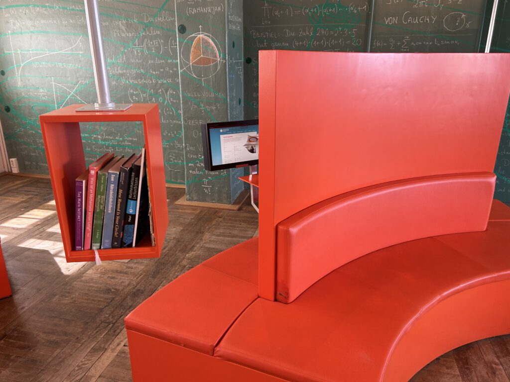Am Infopoint kannst du es dir auf gemütlichen Bänken bequem machen und in Sachbüchern und spannenden Vertiefungstexten stöbern. Ein Monitor bietet direkten Zugriff auf unsere Website mit allen weiterführenden Inhalten. Außerdem findest du einen zweiten Monitor, auf dem du das Spiel „SigMath“ starten kannst: Hier stellst du dich in verschiedenen Schwierigkeits­stufen kniffligen Fragen aus den vier großen Teilgebieten der Mathematik – Analysis, Algebra, Geometrie und Stochastik. Egal ob Buch oder Bildschirm, alles ist da, um Mathematik zu entdecken.